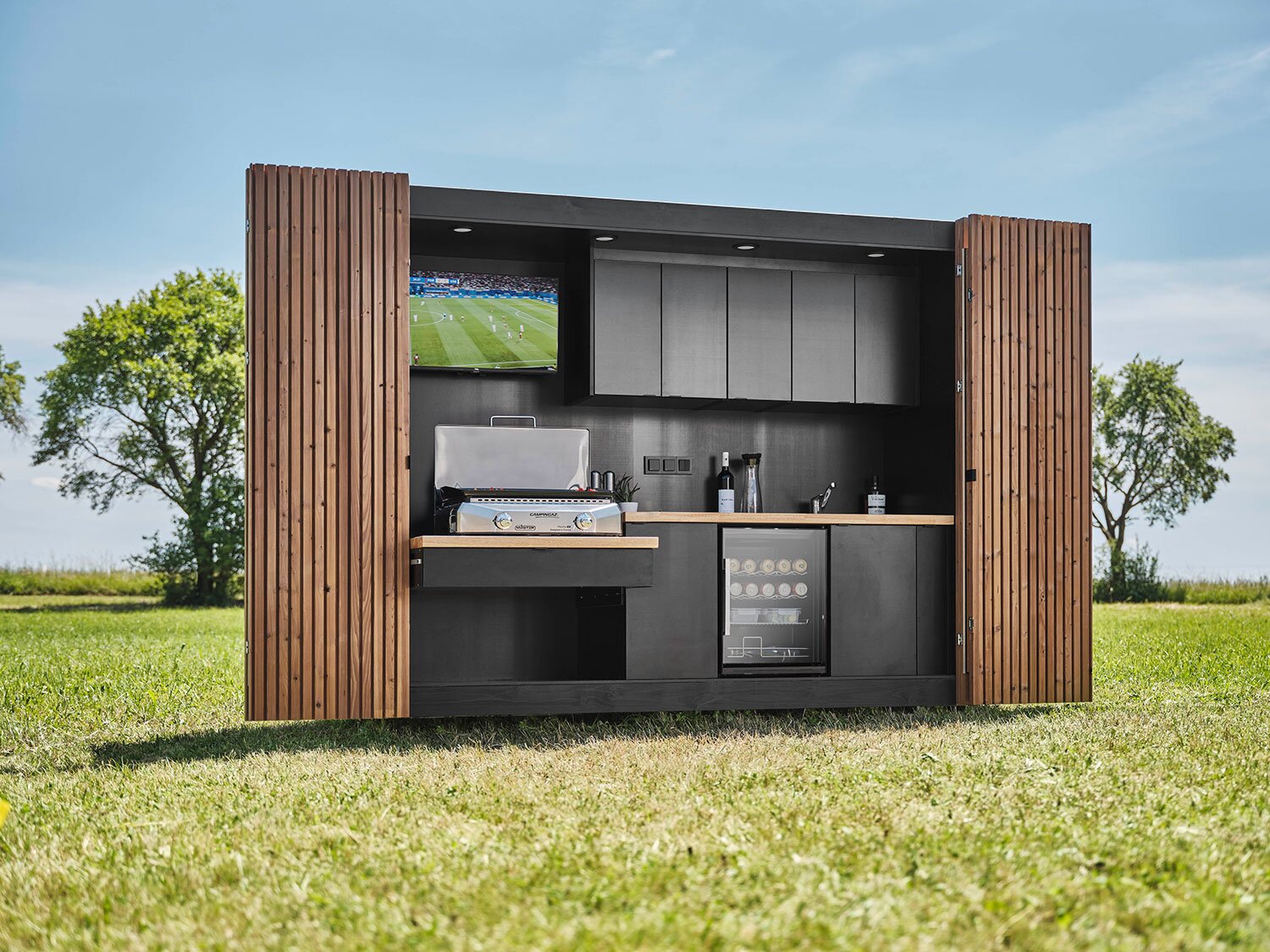 Venkovní kuchyně AITAA je kompaktní venkovní kuchyňský modul, který má za cíl nabídnout „vše v jednom“ pro grilování a posezení na zahradě/terase po celý rok. Podle zvolené řady může obsahovat např. plynový gril, chladničku, dřez s baterií, úložné prostory, osvětlení a u vyšších modelů i televizi. Kuchyň lze umístit na terasu, do zahrady nebo ji použít i jako dělící prvek pro větší soukromí tento text tiež poprosím preložiť.